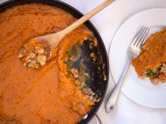 Top the turkey in the pan with the sweet potatoes and bake for 20-25 minutes until the inside is bubbling and the potatoes slightly browned. Cool for 10 minutes and serve
